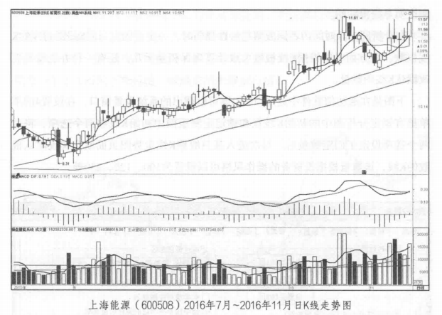 运用这种方式计算均线的角度时,要固定当前走势图上K线的根数。如果计算时参考的K线根数不一样,计算的结果也就会不一样。下面的两幅图是上海能源(600508)同一段走势在不同根数K线图上的角度,在第一幅图上K线的根数偏少,各均线的角度比较平缓,但是同样的一段行情在下面第二幅K线数量明显变多的走势图中看到的角度截然不同,这段行情在第二幅图中对应期间均线的上升角度明显变得陡峭。