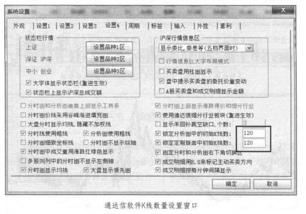 下图是在通达信软件中通过Ctrl+D键可以调出的系统设置窗口,在设置4的菜单里有锁定分析图中的初始K线数和锁定定制版面中初始K线数两个选项,将这两个选项设定了固定数量后,每次进入某只股票K线走势图页面就会实现默认根数的K线,该数量根据投资者的操作风格可以设置为100、120、250等。