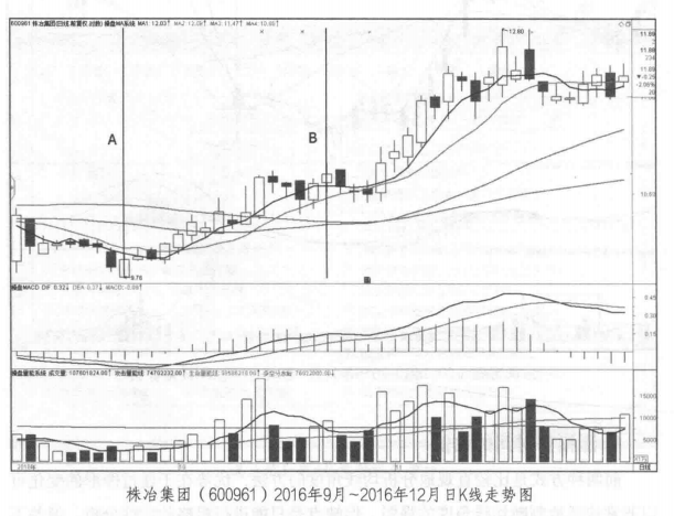 如图所示,株冶集团(600961)在A点对应的时间为2016年9月27日,B点对应的时间为2016年10月25日,计算攻击线、操盘线、生命线和决策线由A点到B点的变化角度的方式就是用B点和A点的差值除以其间15根K线。
