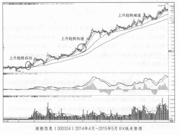 如图所示,旋极信息( 300324)在2014~2015年的大牛市中表现非凡,笔者从均线和趋势的角度来分析操作这样的牛股时该如何持仓。