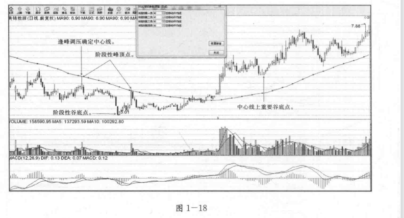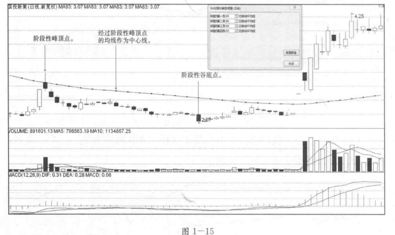 在调整均价线参数值的过程中,可以选择调整对话框中第一条移动平均线的参数值,使其刚好经过阶段性峰顶点,并以此数值的均线作为中心线,接着,再把其剩余移动平均线的参数值都修改成经过峰顶点的相同参数值。见图1一15。