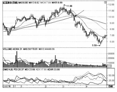 红豆股份( 600400)庄家经过一段时间的震荡出货,股价最终还是选择了向下突破。“一阴破三线"是股价暴跌的临界点,是庄家清仓大甩卖的显著标志。