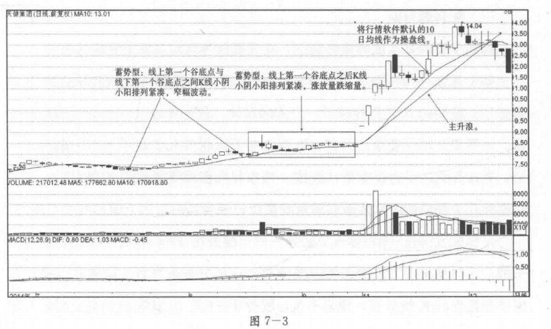 标的个股的基本面不能出利空,而且要符合当时市场主流题材热点。如生意宝(002095),见图7一1。该股在10均线下方的形态是很明显的蓄势型。