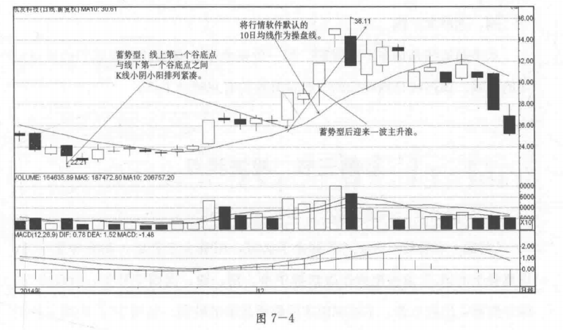 又如成发科技(600391),见图7一4。股价在2014年10月底形成阶段性头部,这明显是主力机构在相对高位卖出一部分筹码所致,缩量跌下来后形成了圆弧底的K线形态。相隔不久,股价于11月26日在前期高点附近高量柱拉出一根涨停大阳线,仿佛主力在宣告他的操盘意图,其后经过四天小阴小阳的横盘蓄势后,主力借军工利好政策的出台再次放出巨量,一举突破前高。