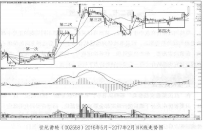 如图所示,世纪游轮( 002558)先是在相对低位走出了4根均线粘合的走势,之后向上选择了方向,在上升趋势的运行过程中,生命线和决策线的角度没有办法跟上攻击线和操盘线的角度,所以攻击线和操盘线必然需要调整,以等待生命线和决策线“跟上”。