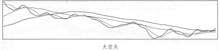 大空头:各周期均线从下到上会呈现随周期加大依次排列的状态,相邻两根均线之间的距离逐渐变大。
