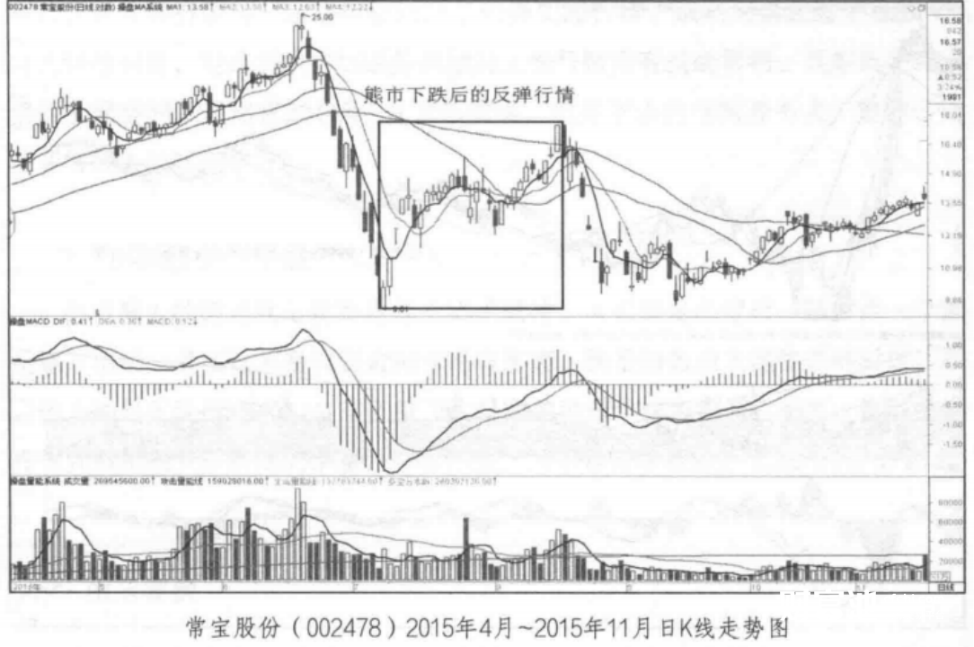 下图中常宝股份( 002478)的走势就是上图中两轮“股灾”对应的走势,在第一轮下跌时常宝股份比大盘跌得更凶,反弹的幅度也比大盘更大,反弹到决策线时滞涨。根据反弹行情只操作三波的原理,在股价遇到决策线的压力时就要果断离场,因为在大盘还具有下跌的系统性风险时个股下跌的幅度往往会更深。