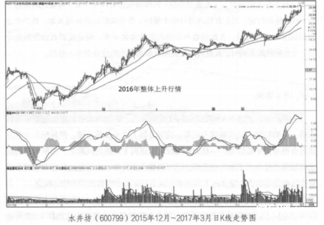 从2016年3月大盘开始正式反弹行情时,水井坊就启动了强势上涨行情。虽然大盘经过了2016年4月的强势调整,但是对水井坊强势稳健的上涨行情没有丝毫影响,其走出了近一倍的上涨空间。虽然在2016年7月开始横盘,但是下杀的空间并不大,整体还处于非常强势的整理期。