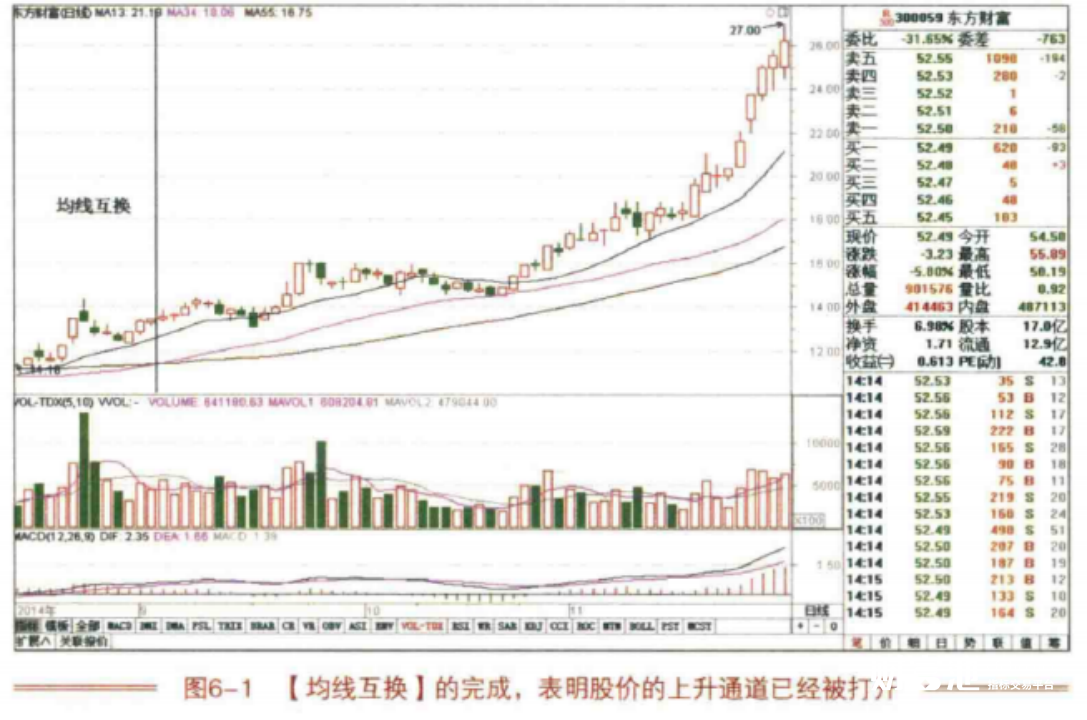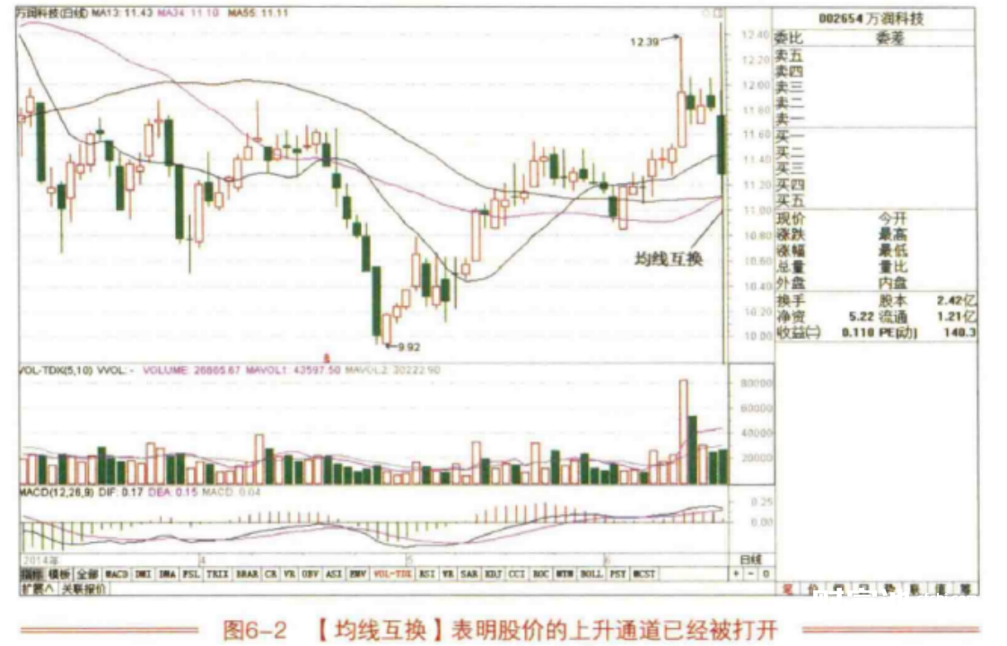 万润科技(002654)。如图6- 2所示,2014年6月19日,34日均线上穿55日均线,[均线互换]出现,当[均线互换]完成的时候,34日均线的数值一定要大于55日均线的数值,否则,[均线互换]就不能视为完成,没有完成[均线互换]的个股,上升通道就无法被打开,而尚未打开上升通道的个股,所有的行情都属于昙花一现。
