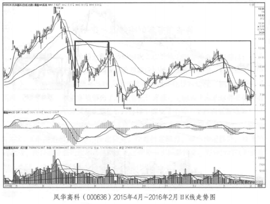 又如,第一眼看到风华高科( 000636)的走势时,很难确认哪里是横盘整理区间,找来找去唯一能够确认的就是下图中用小框框住的反弹行情,此时可以看作是前下跌趋势中的一个中继行情,该反弹行情走出了清晰的ABC三浪形态,之后股价又开始强势下跌,两个下跌波段和一个反弹行情构成了一个更大级别的下跌A浪,之后股价再次走了一波更大级别的反弹B浪和最后下跌的C浪。