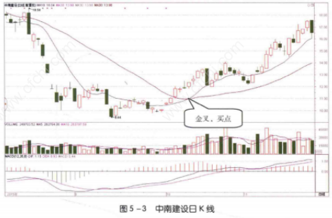 如图5-3所示,2015年10月15日,中南建设(000961)股价见底后,经过一段时间的反弹,其10日均线突破30日均线,形成金叉形态。这个形态说明该股在10日内的平均股价已经超过了30日内的平均股价,股价正处于上升的趋势中,未来股价将会处于这种上涨趋势中持续上涨。因此这是一个看涨买入信号。看到这个形态,投资者可以积极买入股票。