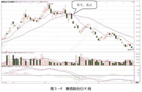 如图5-4所示,2015 年6月26日,腾信股份(300392) 股价见顶下跌时,其10日均线自上向下跌破了30日均线,形成死叉形态。这样的形态说明该股10日内的平均股价已经低于30日内的平均股价,股价处于下跌的行情中。未来这种下跌行情将会继续下去。看到这样的形态,投资者应该尽快卖出股票。