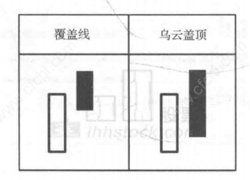 二者图形见下图,从图中可以看出,二者的区别就是覆盖线仅覆盖掉前一根阳线的顶,而乌云盖顶则覆盖掉了前一根阳线的2/3。