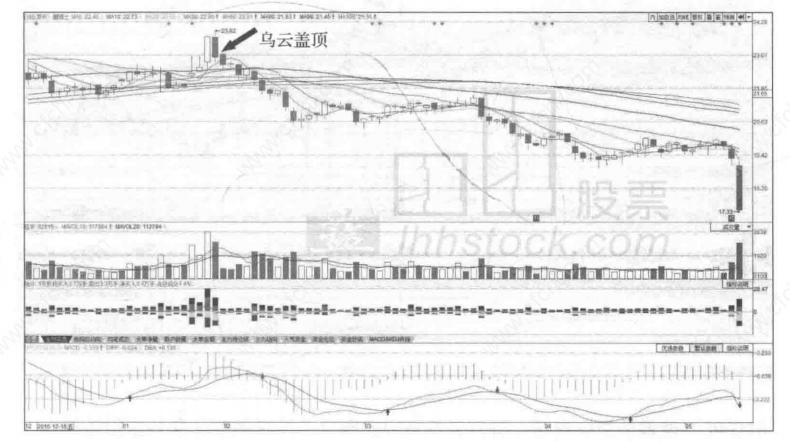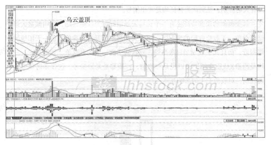 乌云盖顶是指股价经过一段小幅上涨后,最后以多日或一日收出中大阳线,次日高开,买盘不想追高,使涨势变为跌势,收盘价跌至前一天的阳线1/2以下,盖住阳线近2/3,因此叫乌云盖顶。