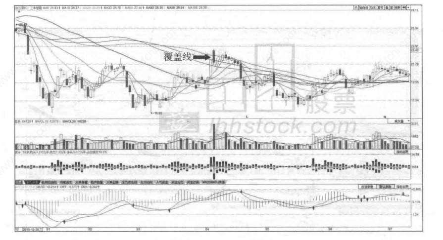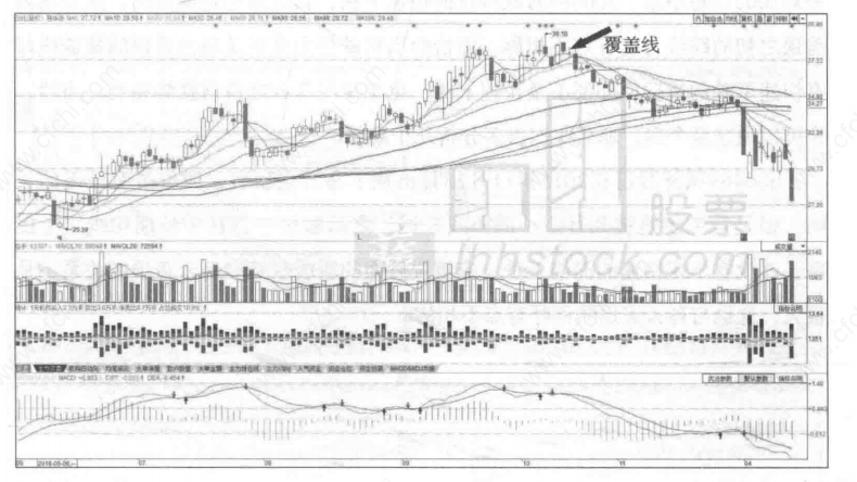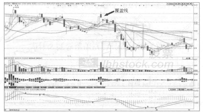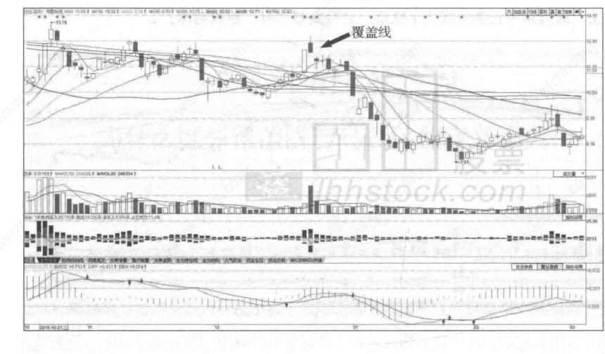 覆盖线是指股价经过一段小幅上涨后,最后以多日或一日收出中大阳线,次日高开,买盘不想追高,使涨势变为跌势,收盘价跌至前一天的阳线以内,有被覆盖之势,因此叫覆盖线。
