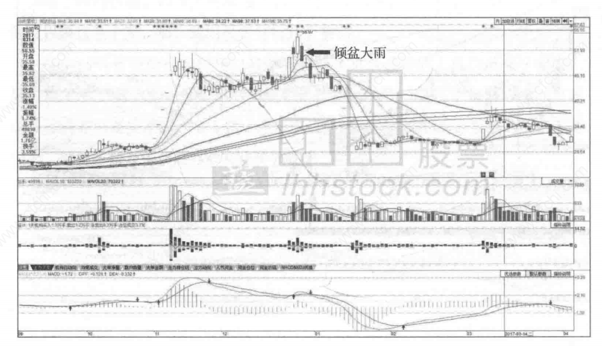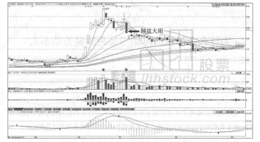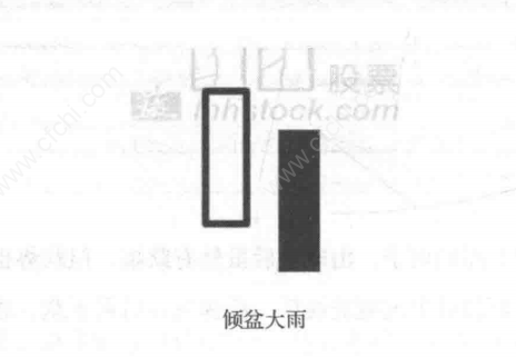 其实类似的顶部特征还有一个比乌云盖顶即时力度更大的,它叫倾盆大雨,就是在前一天股价收阳的情况下,第二天却跳空低开,开盘价在前一天阳线的中部附近,而且几乎成为当日最高价,收盘低于前一天的开盘价。如图所示。三者均是两根K线组合图,可以说是三胞胎,性质都是见顶信号,仅仅即时幅度上有点差别,对股价产生的影响基本一样。
