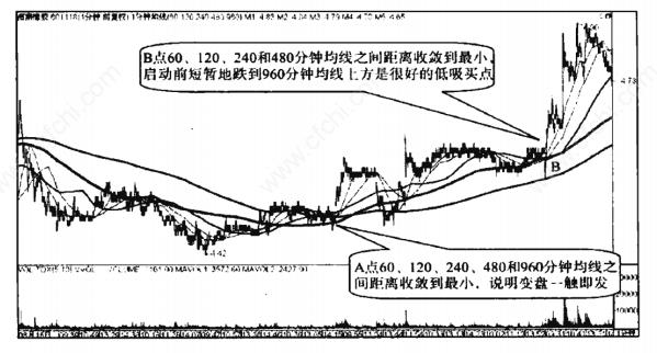 多空力量的不断较量基本上还是处于旗鼓相当的态势,那么要到什么情况下才会发生大的变化呢?答案当然还是要在各条均线之间的距离处于最小状态之时了。B点处的60、120、240和480分钟均线之间距离收敛到最小,启动前短暂地跌到960分钟均线上方就是很好的低吸买点。