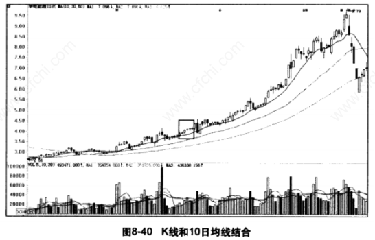 当K线图与10日移动平均线纠缠在一起时,不要轻易跟进。只有等10日移动平均线与K线图分开且上行时,才是买入信号,如图8-40所示,表明多方力量增强,后市上升的几事变大。