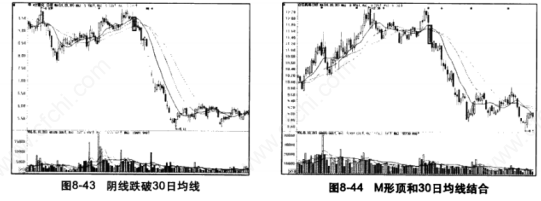 股价经过一段时间的下跌,连续出现的阴线跌破了30日移动均线,表明空方的力量逐渐增强,卖点出现,如图8 -43所示。投资者应当在股价跌破均线,趋势将要发生逆转时及时卖出股票。