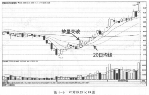 如图4-9所示的双箭股份K线图,就是在上涨的过程中,小幅回调之后,在10日均线的支撑下,放量向上突破了20日均线。确立了上涨趋势后,后市又有不小的涨幅。
