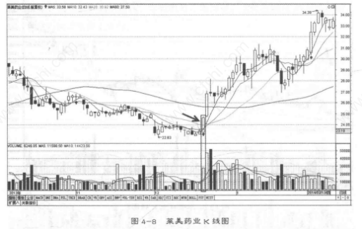 如图4-8所示的莱美药业K线图,前期经过一段时间下跌后,进行短暂的整理并成功筑底,出现了一阳穿多线的形态,股价随即继续展开拉升行情。