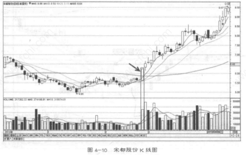 如图4-10所示的宋都股份K线图,股价探底成功后,小幅震荡向上运行,某日突然放量向上突破60日均线,且之后三天内始终在5日均线上方强势运行,没有再试探60日均线的支撑,说明多方较为强势,60日均线后期将可能转换为一条重要的支撑线,可放心介入。
