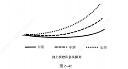 均线粘合形态结束后,存在着一个方向选择的问题,这个方向性选择就会带来均线的另外一种形态一均线发散。提到均线发散,很容易联想到均线厚度空间。出现均线发散,意味着多条均线之间必然具有多层厚度空间,这是对于价格的多层保护,也是价格处于强势启动阶段的一种表现。均线发散具有两种形式,即向上发散和向下发散。