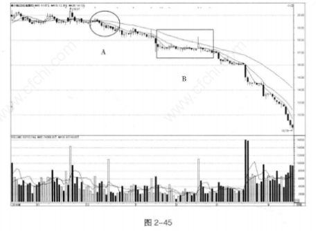 图2-45中,该股在均线黏合形态结束后,于A点均线开始向下发散并形成空头排列。均线向下发散和空头排列对于价格的压制作用非常沉重,尤其是刚刚结束黏合形态,空方势头正盛,做空或者空仓等待是最佳的选择。