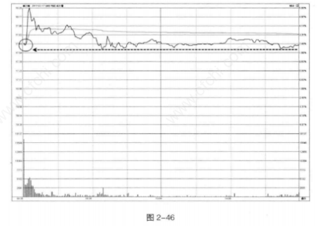图2-46中的分时走势,即为图2-45中B点那个单日强弹当天的走势情况。当天高开后急速冲高,之后全天几乎都在回落过程中。即使没追高,而是在股价逐波回落的过程中买入,第二天股价低开,也会将买入者直接焖杀,几乎没有获利的可能。