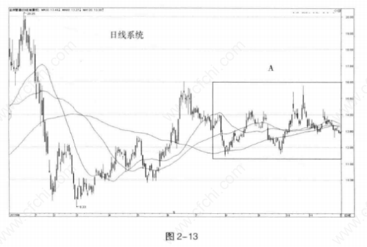 如图2-13所示,该股经过大幅暴跌之后股价转升,至A点股价进入一个幅度较大的波动盘整阶段,走势上较为凌乱多变。图中的中期均线系统从A点之前两层厚度,到进入A点系统厚度消失,三条均线已经呈聚拢状,并且股价已经再次跌破均线系统的支撑,由此来看,该股股价后期走势不容乐观。