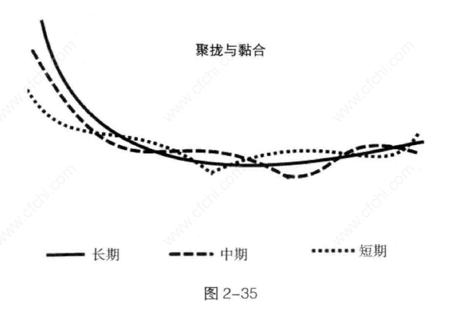 其二是黏合,指多个时间周期的均线相互缠绕,运行于一个狭窄的箱体内,之后选择突破方向。如图2-35所示。
