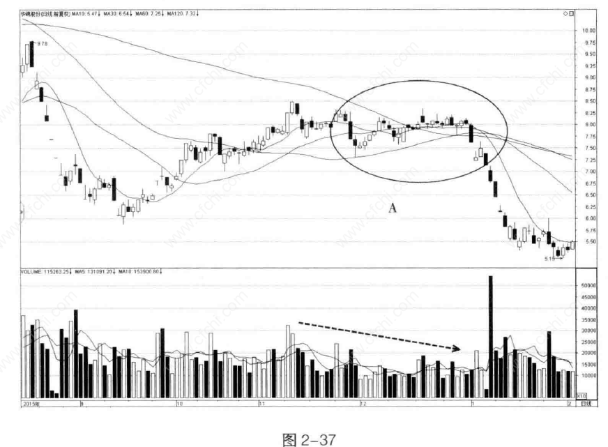 图2-37 中,股价反弹后,其重心基本呈横向运行态势,缺乏有力的方向性引导。均线系统尤其是中长期均线,并不能提供较强的支撑,成交量在聚拢期间也呈消散状态。这些技术上的不利因素相叠加,该股走出失败形态也就不足为奇。