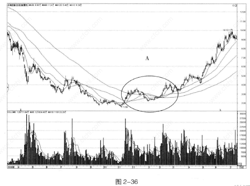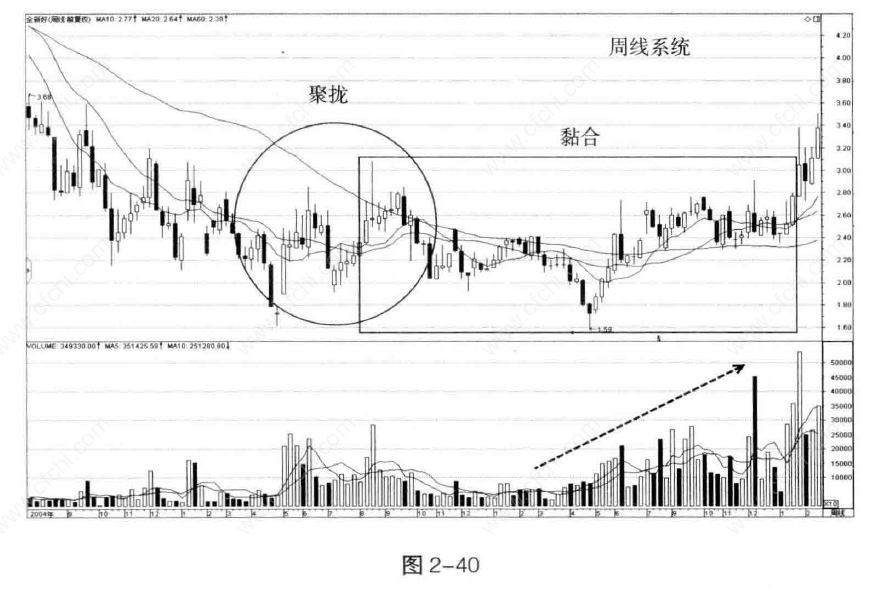 图2-39 中,该股经过长达5年多的下跌过程,至图中时,各条不同周期的均线逐渐聚拢、黏合。图中的黏合过程维持了将近两年。在黏合形态的后期,成交量也明显出现聚量,应该说多项指标都非常符合逆向扭转的条件。