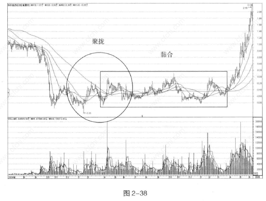 图2-38中方框标示的黏合区域,10日、30日、60日、120日均线都已加入黏合过程,这个黏合区域维持的时间长达一年。