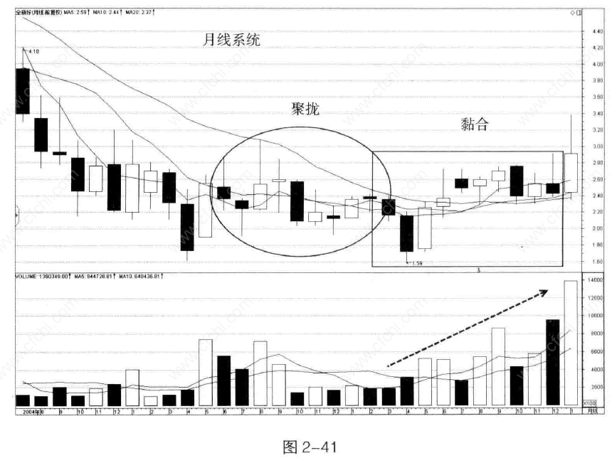 图2-41中展示的是月线系统。均线系统的聚拢、黏合过程同样的一览无余。
