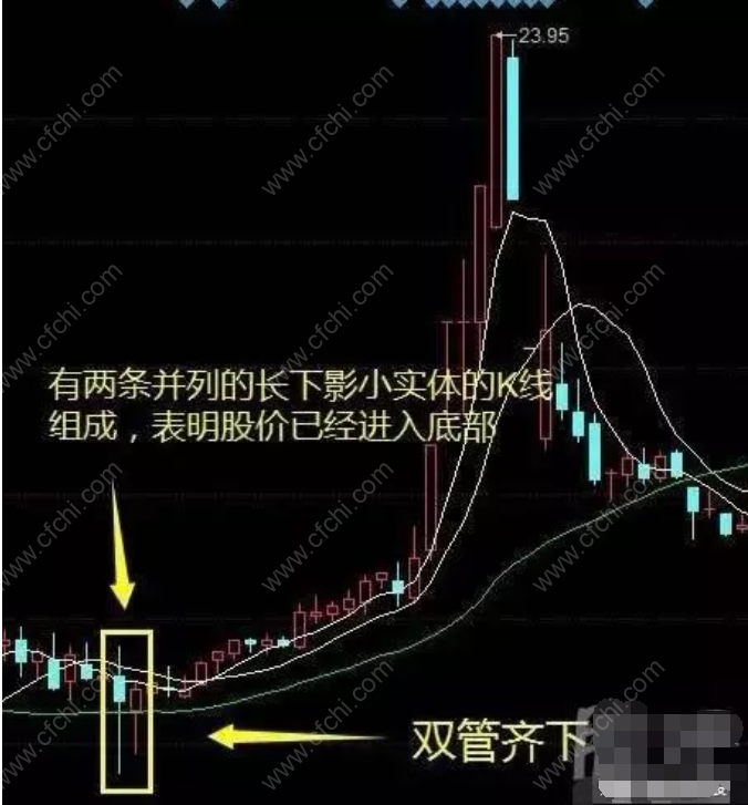 图例二,“双管齐下”,买进不怕。“双管齐下”是由两条并列的“长上影小实体”的K线组成。股价下跌到10日均线下后,在30日均线处如果这种图形的出现,就说明做多的力量强大,同时也表明,这个价位,抛压不重。股价已经进入了底部或者距离底部不远,中长线投资者就可以开始建仓,短线也可以介入,后市获利一般较为可靠。