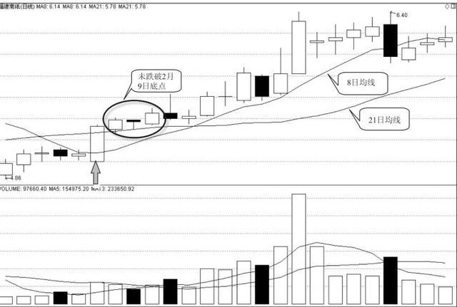 在这波走势中,21日均线整体呈现平缓向上的趋势,从2011年2月9日起,8日均线开始出现拐头,同时股价成功站上8日均线,而在随后3个交易日股价始终未跌破2月9日的那根K线实体的最低点。从随后的一波大涨行情中我们可以看到,该股自2月9日到3月3日十几个交易日的时间里,股价从5元最高上涨到6.4元,涨幅达28%。