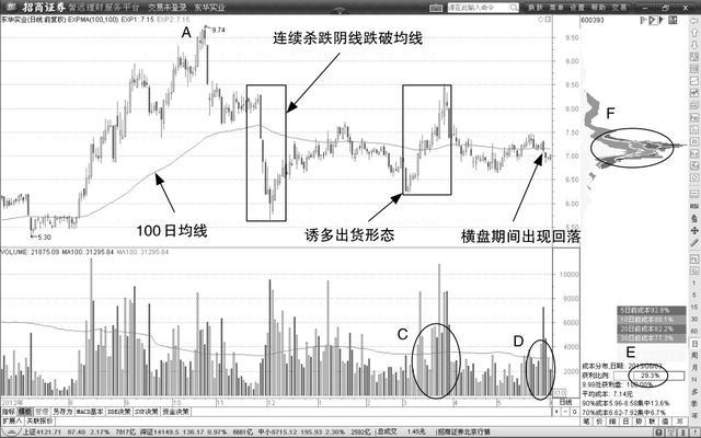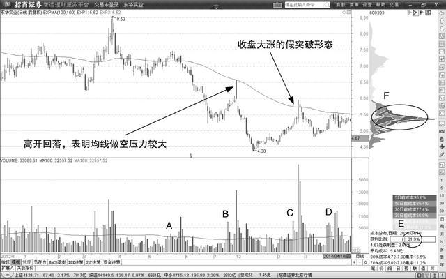3. 从筹码图来看,图中E位置的筹码获利率为31.9%,表明价格回调期间已经有少量投资者盈利。空头趋势中,少数投资者盈利以后,价格如果可以回升,一定要继续突破高位筹码峰才行。图中的F位置筹码峰规模较大,是单一的筹码主峰。等待成交量继续放大的时候,价格才更容易突破这个压力位。在价格确认突破100日均线前,我们利用均线提供的压力做空,能够达到较好的操作效果。