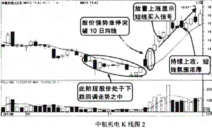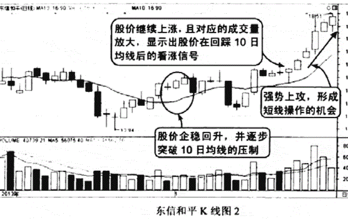 果然,当股价回踩10日均线后伴随成交量的放大,股价继续商扬。由此显示后市看涨,投资车适时售出股票即可获利。