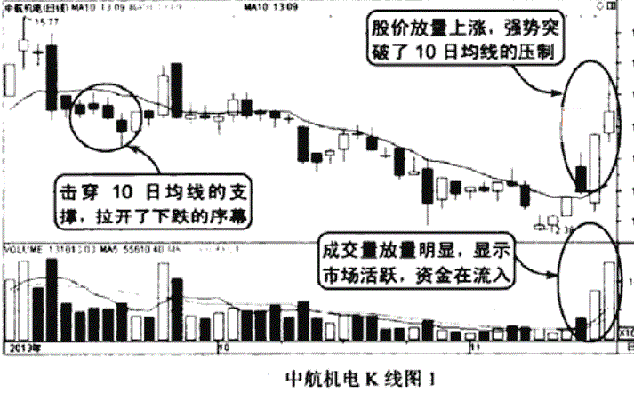 股价向上突破10日均线,是市场强势的第一信号,当这样的走势出现时,就预示着市场短期有望走强,投资者可以寻找短线操作机会。