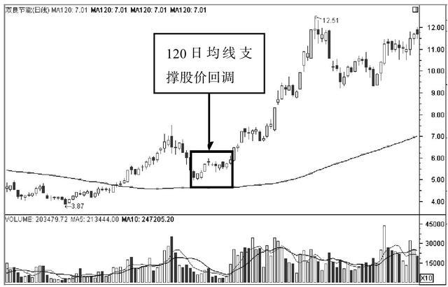 如图2.6所示为双良节能日K线图。图中的K线时间周期为日,这主要体现中短期走势,而图中选用的移动平均线周期为120日,因此又兼顾了长期走势行情。股价从3.87元开始上涨,这时中途出现了明显的回调行情,在回调时成交量明显萎缩,这也意味着股价并没有开始反转。当股价运行到图中椭圆形标注的位置时,受到120日移动平均线的支撑而开始继续上扬,而且在此时成交量再次增多,说明多头将继续推升股价,因此这是市场给投资者的一个买入时机。
