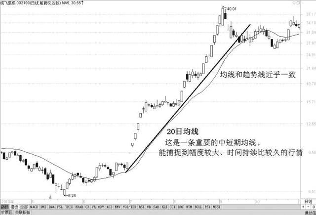 20日均线较好地反映了这波中期上涨行情,虽然没能卖在最高点,但它能把握到一波持续时间长而大的行情。该均线近似一条倾斜向上的水平趋势线。(如图1-18)