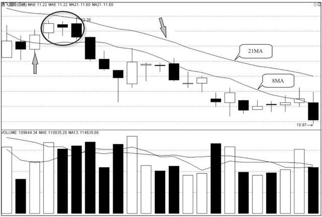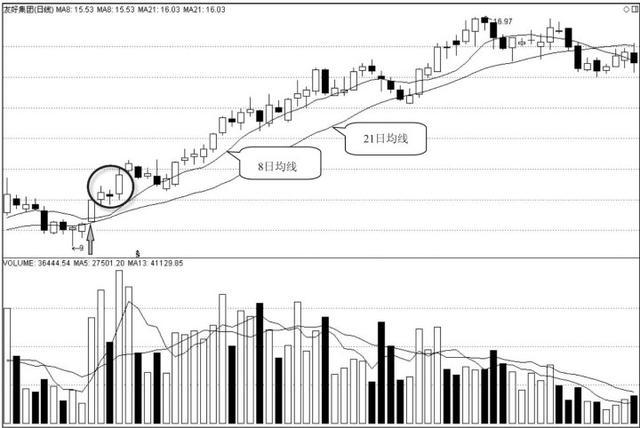 在这里需要注意的是,虽然我们是以8日线作为操作参照,但一定要考虑到“21日线整体处于上行趋势或由原来的下行趋势转为走平”这个大的前提,不然买入的成功率会大大降低。
