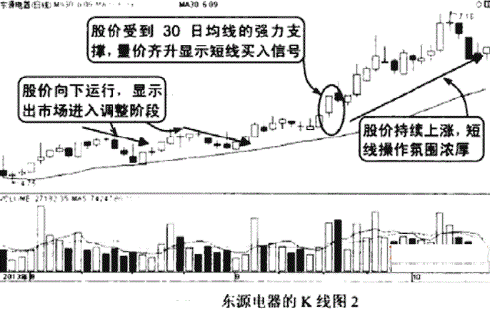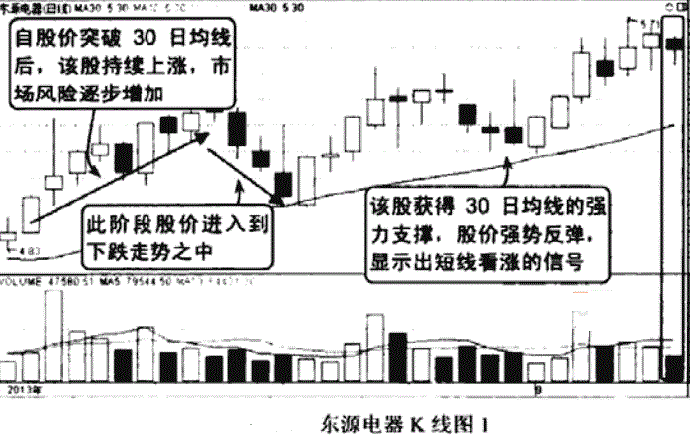 另一方面,30日均线对于股价的下行有强力支撑,因此当股价下跌到30日均线位置时,市场反弹几率大增,会创造出极好的短线操盘机会。如下图所示为东源电器(002074 ) 2013年8月到2013年9月的走势: