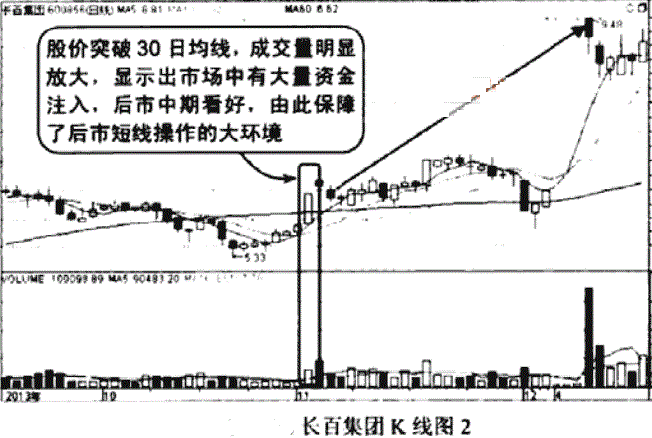 图中透露了股价中期趋势的转变,其转折点就是股价放量突破30日均线时,由此形成了股价中期向上的趋势。把握住股价的中期上涨走势,投资者大可以在股价回调低位时大胆进行短线买入操作。