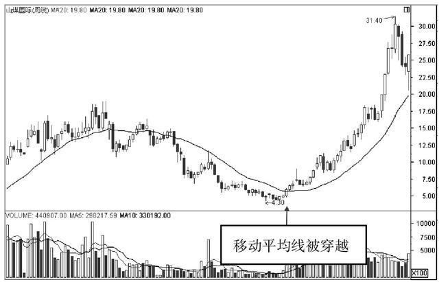 如图2.1所示为山煤国际周K线图。图中的移动平均线为20周移动平均线,属于中短期移动平均线类型,因此能够很好地体现出中短期走势。股价在4.30元时达到最低,此后便小幅上扬,成交量也逐渐增多。在箭头指向的位置,一根阳线向上突破了20周移动平均线,尽管K线的实体较小,但是此时却有着重要的意义。因为一旦股价向上穿越20周移动平均线,就标志着未来很有可能将继续上扬。尽管K线实体较小,但是成交量却出现了明显地增多,说明有雄厚的资金支持股价向上穿越移动平均线。此后股价便一路高涨,直至31.40元。因此在移动平均线刚刚被穿越时,是非常好的一个买入点。