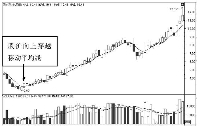 股价在2.60元走出新低,而在下一个交易周,一根阳线穿越了5周移动平均线。由于5周移动平均线滞后性较小,因此所发出的买入时机也相对较早。但是这不影响买入信号的准确性,因为在股价向上穿越移动平均线时,成交量也出现了增多的迹象,这也说明有资金来支持股价向上不断攀升。