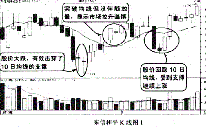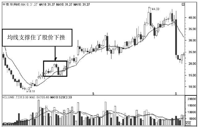 众所周知,移动平均线对股价有一定的支撑作用,因此当股价从上向下跌落到移动平均线附近时,往往不会轻而易举地向下突破均线,只要股价不能向下突破,而受到均线的支撑开始转入向上的行情时,投资者就可以买入股票。