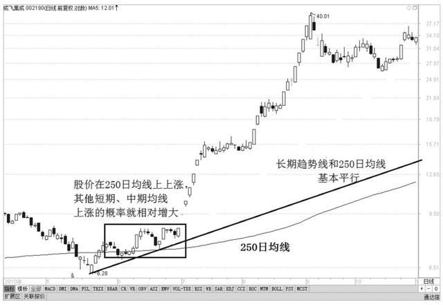 看了几条短期均线后,再来看看长期均线的走势。图中250日均线虽然没有及时地反映出股价的剧烈上涨,但股价是在它之上上涨的,这本身就为其他中短期均线提供了安全保障,以此为基础,中期均线上涨的概率增加了。随后,短期均线也随之上涨,共同促成了这波暴涨行情。(如图1-19)