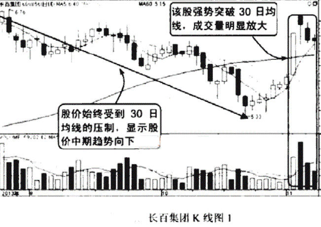 从图中可以看出,该股在左侧走势中始终处于30日均线的下方,由此显示了市场中期弱势向下的特点,所以不具备短线操作的大环境。当创出5.33元的新低之后,该股缓慢上涨,之后该股强势放量突破了30日均线的压制,股价中期趋势得到改变,短线操作的大环境开始形成,如下图所示: